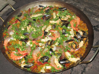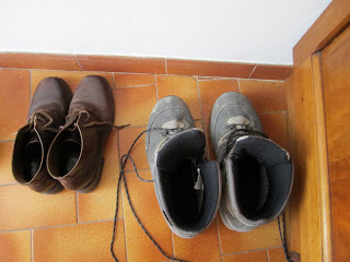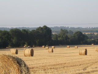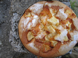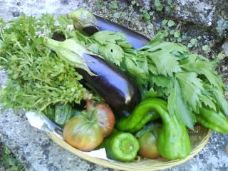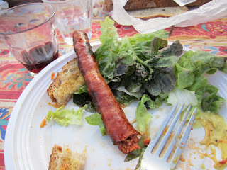 The days are hot and sunny - lunchtime is a search for shade. The evenings are cool and often breezy - ideal for long dinners in the garden (G. managed to snap this photo of both tomato salad and the view from our upper terrace.) I too am being eaten - the misquitos have been feasting on my ankles. My dad used to say it's because I was "sweet meat"...