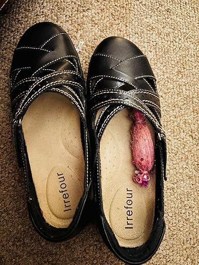 That is a cat toy in one of my shoes. I asked my kitten to bring it closer to me. We were playing an exciting game of fetch when she decided that bringing it closer meant putting it in my shoe. She’s napping now. I wore her out.