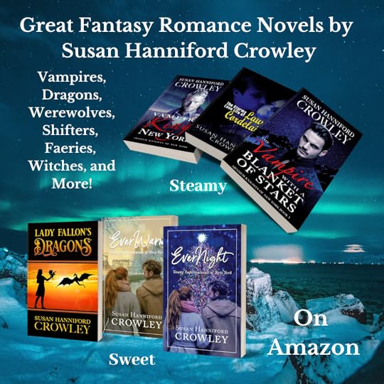 Above is a sampling of my books. While I have some available in paperback and on Kindle, some are available in Kindle and/or other ebooks. You can see the entire list beneath my name. Visit here to see all the others. https://www.amazon.com/stores/Susan-Hanniford-Crowley/author/B004YXOGXG I write both steamy paranormal adventure romance and sweet or YA paranormal adventure romance!
