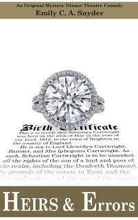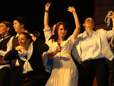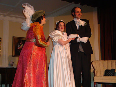 Heirs & Errors: While I directed those shows, I also directed another original play: this one the first dinner mystery theatre that I'd ever written. It was a really interesting experience, because writing a mystery requires a lot of forethought (of which I typically have little). Thanks to the wonderful cast, however, they not only brought the show to life, but they even allowed me to see places where we could be a little more overt in our clues and consequently emotional with our acting. We also did a lot of cast and audience interaction, which is always fun. Once again, though, we had some technical issues since 1) we had to cancel opening night b/c not enough publicity had been done to get enough audience in (however we ran it anyway for a select few who could only make that night) and 2) it was in an ooooooold building with weird wiring, so sometimes the sound or lights would blow out if we turned them up too high. (Oh the joys of old wiring.) Fortunately, we sorted out the bugs during tech...only to have one of our leads blow out his knee before the last night of performance. He decided to go on anyway, with a cane, and actually used that cane to very good advantage...which made me wish he'd asked for a cane earlier.