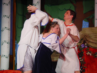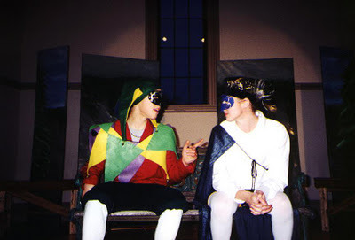 As You Like It: I've wanted to do this show since 2000, and this year I had my chance. We had a great Rosalind, and she had a wonderful cast, and we had one of our more ornate sets...which took up a lot of time painting, and which also took up a lot of time putting back in Holliston...in the rain...without raincoats...up a muddy hill...with only a few of the cast and crew. That wasn't so fun. I also got to play with gobos, which was neat. I'll admit, this is a show that I think I'm going to come back to a lot. It's a rich play, and I'm still processing it. One of the things I really liked, though, was how the script was rearranged so that we kept a through-line from Act I's politics into the woods. It was also fun "Killing Kayleigh Kenny" (aka Jacques LeBeau - see right). And showing Oliver and Orlando fighting one another! And Touchstone's puppets. And the improv about the good china that Celia and Rosalind had.