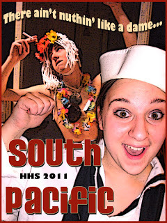 South Pacific: I wasn't supposed to work on the all-school musical for 2011 (because I was doing Tartuffe & Curses! simultaneously) but Mrs. McKenzie's music director dropped out two weeks before show. So I got called in as a "vocal coach" and taught the ridiculously easy and choral/harmony-free score to some pretty durn talented kids. I also took some promotional photos, which is always fun, and I oversaw the sound design like usual. That show actually had a lot of sound issues, b/c I was running backstage anyway to get a wet mike on Nellie for the *nnnnnngh* hair-washing scene...but for whatever reason the mikes kept shorting out, etc., so I was constantly running back and forth to the different wing, ripping mikes off of high school students when they stepped off the stage for just a second, re-miking them and throwing them back on with none the wiser. A technical ninja if I do say so myself. *plop*