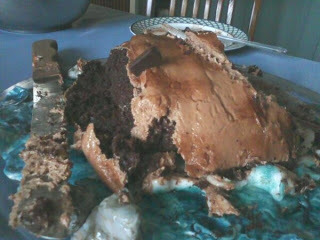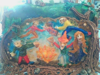 The pictures don't do it justice. The incredible artistry of the waves of the sea, the trees, and the little chocolate woodpile! All the little fairy folk and the roaring fire: absolutely gorgeous. Everyone said it was almost too beautiful to eat -- but we managed to find a way to do it. As Maryann said (or was it Allan?) it's kind of like a Buddhist sand mandala -- painstakingly created but not meant to last. Except chocolate, mmmm.