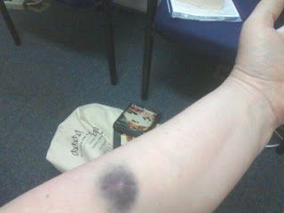 Read the rest at BBHQ: less than a week before I vault off across the pond. Yikes! Much to do; at least all the medical folderol has been completed and the form giving me medical clearance should have been sent. Despite the look of it, my TB test was negative -- just bruised (and a lump for the first day).