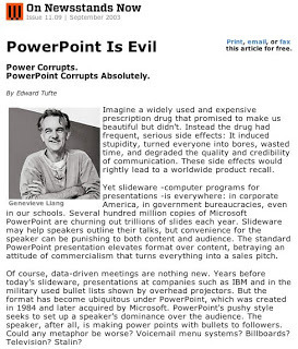 I used Tufte's piece in my own PPT presentation, which as folks on Twitter know, has almost 80 slides. I've described it as being sort of like "The Word" on The Colbert Report. Will this work? Who knows. Still tweaking. But I printed my boarding passes. If you're on Facebook, I'm now having a contest to guess how many gratuitous pop culture references I make in the forty minute speech. Go on, have a guess.