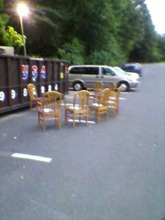 In the parking near the dumpster was this semi-circle of chairs. There were some papers on the seats, but I did...