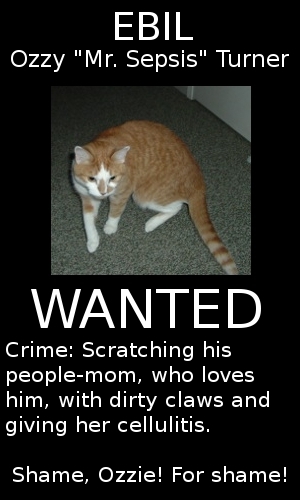 Tuesday, we took Mom’s cats to the vet. Long story short, she was holding Ozzie and he didn’t want to be held. When he jumped down, claws went hither and yon into her arms. One of those claws had apparently been somewhere it didn’t have no business ta be, and that one puncture got infected.
