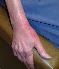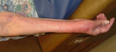 I spent the night with her, natch. About 4:30 in the morning, I heard a thump and ran into her bathroom. She hadn’t fallen, but her knees had given out. She was weak, and her hand was more puffy and the red streaks were worse.