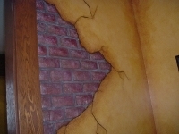 This is a faked-up detail intended to make a place look older than it is, as if the stucco had crumbled and exposed the underlying brick. Very Storybook Style. Just one thing, about this one, though: It’s a plastic panel of brickwork glued on OVER the paint. Looks great from a distance, but kind of surreal up close. Maybe skip that second beer, after all.