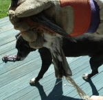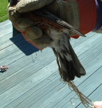 Charlie held the robin, who didn't peep or struggle or roll his eyes or twitch or pant or anything. The bird — a full-grown male robin — just held still while I carefully snipped and unwrapped until he was free. I've never seen a wild bird so calm in human hands. Charlie put him down on the porch, and he flew away into the woods. The robin did, I mean, not Charlie. This isn't magic realism, here, this is FACT. I hope the bird was all right, but we'll never know.