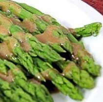 9.Place asparagus pointing the same direction on a plate, add the dressing, and roll the stalks to coat them.