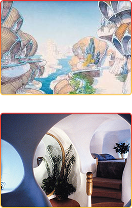I found the web site of the great and magnificent Roger Dean, album cover designer for Yes, Uriah Heep, Cream and others. He also designed the most … indescribable architecture, that first broke my mental mold about houses having to be boxes with rectangular holes in them. Here is one of his concepts in design in actual fact, linked to from his site.