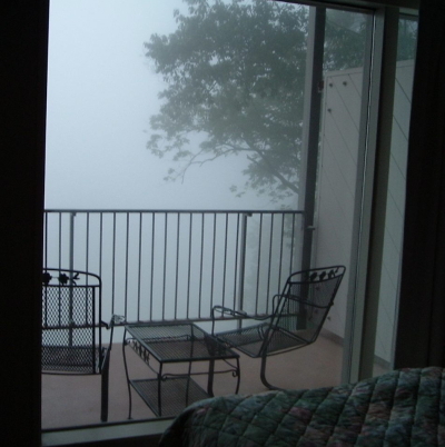 The second is of Charlie and my honeymoon (yes, that is grammatically correct) and our 25th anniversary, both of which were spent at Natural Bridge State Resort Park in Kentucky. Every morning, the fog completely enfolded the lodge, but burned off as soon as things warmed up. I'm talking about the sun, people; get your minds out of the gutter.