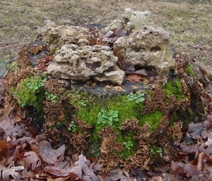 And here is a stump my husband is killing slowly, in conjunction with jolly old Mother N. He heaps what folks around here call fossil rocks on top of them, and Ma Nature sends rain and moss and bugs and what-have-you to nibble away at their flesh. The Melbourne Method. ~shudders~ Not the Melbourne Method!