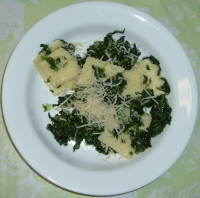 Cook the ravioli and spinach together. Drain. Toss gently with olive oil. Put on plates. Sprinkle with capers and cheese.