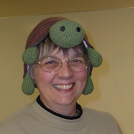 So a friend of a friend crochets while she does phone work, and she made the exoskeleton of a stuffed turtle. Without the stuffing, it looked like a hat, and my friend said, "I know a woman who would love that hat!" And the crochet lady said, "It isn't a hat, but I could make a hat like that." So she did. And she gave it to my friend, who gave it to me.