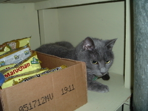 Finally, because my mother says this blog has been all about other people lately, here is a picture of my cat, Katya, in her new hangout. In the pantry. Two shelves up. Behind the ramen. Yeah, she's wack. If I put a soft blanket and a play-toy up there, she'd abandon it and find somewhere else desolate to crouch. I think she's playing Apocalypse or something. "Here's the survivalist kitty, safely ensconced in her secret bunker, food supplies nearby. She is alone, as all survivors must, ultimately, be alone, for who can you trust in these desperate days?"