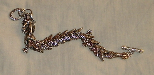 Well, these two, I got at fiction conventions, both from Oh So Fine, Inc. I don't know why this dragon keeps coming out looking bronze–it's as silver as silver can be. I had to get it because, well, look at it! It's a Chinese dragon, like the one in my under-construction fantasy trilogy, SAGE, and it's articulated! When I'm not wearing it, I can totally play with it. Do puppet shows with it. It's a bracelet! It's a toy! Wait–you're both right–it's both!