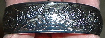 This one is impossible to show properly. It's so SAGE! It has a holy mountain in the center with a pearl like the sun above it. On one side is a phoenix, with its tail flowing behind it. On the other side is a Chinese dragon with its long body flowing behind it. There's a bronze bracelet in SAGE that's very like it, and I may very well rewrite that bracelet to match this one.