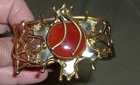 Okay. I met my friend Jane for lunch yesterday and she gave me birthday presents. She says she got this bracelet at a second-hand store. Man oh man oh man, would you LOOK at it? Obviously hand-made, very one-of-a-kindish. The stone is carnelian, the metals are bronze, copper and something silver-ish. Isn't that a knockout?