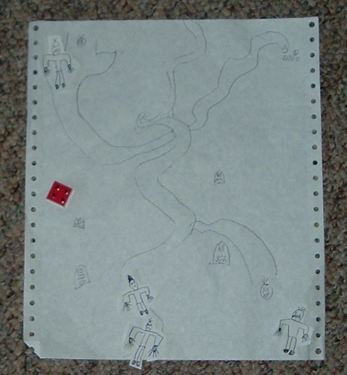 Youngest Grandson made good on his promise yesterday, and brought a two-player game he made. It's called Escape From The Graveyard (Copyright 2011 by Youngest Grandson). He made the board and the playing pieces (one Live Guy and three Zombies), and he even made the die from a Lego piece with dots drawn on it.