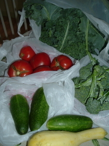 We're sharing this stuff with Mom, so it will all be eaten. Kale, tomatoes, broccoli, burpless cucumbers and yellow squash. I always cut the neck off the squash and put in in a stir fry or on a veggie pizza, then slice the body long-ways, dredge it in flour, and fry it. I'm going to try making kale chips with some of the kale. They sound delicious. Shut up–they do, too.