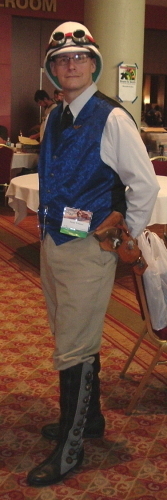 Wonderful costumes! The emphasis this year was on Steampunk, which delighted us. Personally, I never was too crazy about zombies, and I prefer my vampires to be more "two small puncture marks" than streaming with gore, so gears and airships make me do the happy dance. ~waves at Amanda Borenstadt~ I've never written Steampunk, but I've read some lately (Crystal Rain by Tobias Buckell [reviewed here] and The Burning Sky by Joseph Robert Lewis [currently reading]) and, of course, I've read many of the precursors (Jules Verne et al). I love the concepts, I love the clothes, I totally love the jewelry.