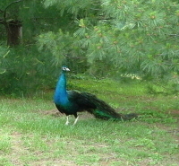 I had to drive all around Robin Hood's barn to the back of beyond (that means a long and winding way) to get a family farmed ham for the Memorial Day picnic. On the way, I passed long-horned cattle (which I did not, alas, get a snappie of) and this bird, which was wandering around in somebody's yard like a chicken. (The bird was wandering like a chicken, I mean).
