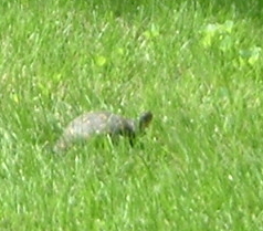 This guy moseying across the back yard. He was probably scouting the garden preparatory to raiding it for tomatoes and cucumbers. These little hard-shell pirates will sniggle into your garden and take a few bites out of whatever is within reach, then move on to another piece and take a few bites out of it. Ticks me off to have to eat a turtle's leavings. Still, he was doing no harm this day, so I just took his picture.