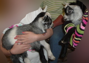 The Young Authors ceremony in which I took part Monday was part of a school book fair and fun fair, which included face painting and a petting zoo. There were rabbits and a miniature collie and these little beauties. I had to snap a picture for my mother, who loves goats. I promised the human kids I wouldn't put their pictures on the interwebs but, when I asked the baby goats if being on line made them nervous, they said, "Bah!" So here is their picture. Aren't they coot?