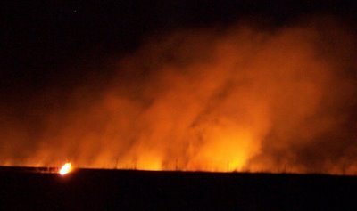 The annual pasture burning is quite a sight to behold with thousands of acres being burnt at one time. The purpose is to eliminate the dead grass and make way for the new by getting a head start on weeds. With the help of spring rains, the charcoaled land will bring forth tender green shoots, rich in minerals. It is said that cattle feeding on this grass will gain 30 to 40 pounds more than they do on an unburned pasture.