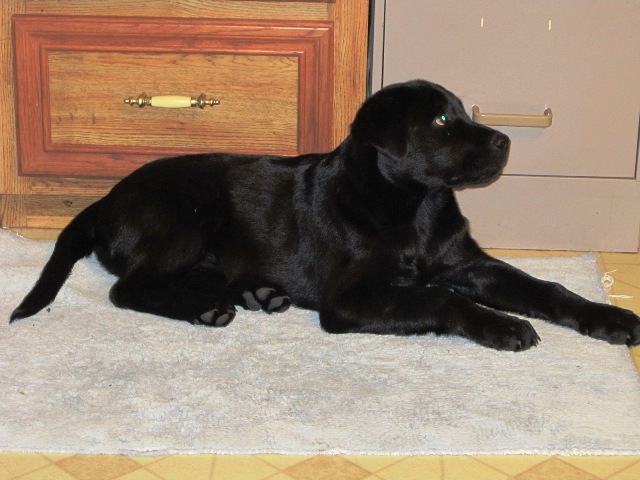13 weeks - being trained to lay on the rugHe stays inside at night and sleeps in our bedroom. It is quite cute. When it gets to be around 9:30 PM, he'll head for our bedroom door, ready to go night-night. Last night, we had the bedroom door open and while we were watching a movie in the living room, Luther quietly slipped off to bed. He sleeps in a large black utility container. I find his snores and puppy noises quite soothing, reminding me of days gone by, when our babies used to sleep in our room in their crib. And he's getting much better about having to get up at night to do his thing. Which is good--really good.