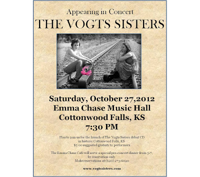 Our first launch party is Saturday, October 27 at the Emma Chase Music Hall in Cottonwood Falls, KS--where their love for bluegrass-folk music began. A pre-concert dinner will be held from 5-7:00 PM by reservation only at the Emma Chase Cafe. Make your reservations for dinner at 620-273-6020. The concert begins at 7:30.