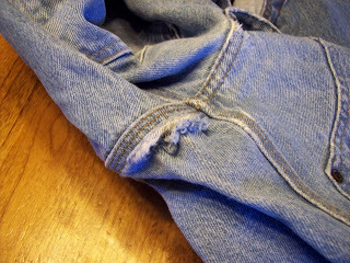 For at least a month prior to this task, I find myself debating whether to throw the worn jeans away, use them as rags, or recycle them into a quilt or rug. But then, inevitably, I'll hear a voice in my head about how much money I'll save by repairing them, or how much more comfortable hubby will be to wear a "broke-in" pair of jeans.