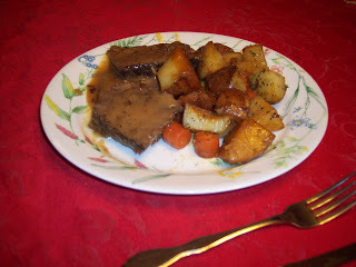 In glass measuring cup mix together flour and 1/4 cup water. Beat well until smooth. Pour into broth mixture and cook until sauce thickens. Serve over roast and vegetables.