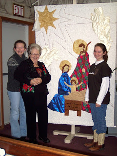 The girls with their Grandma Judi on Christmas morning by the banner she created for the season.