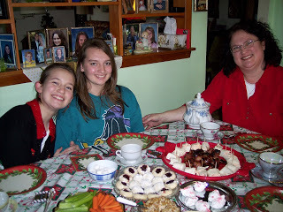 One Christmas tradition I've created for my girls is to hold a special tea party during their holiday break--sometimes inviting ten or more people to join us. This year, we decided to take our tea party on the road. We traveled to my grandma's house and held it there. As always, we made a few goodies to enjoy with our tea. Russian Tea Cakes, Snowballs, Peppermint Meringues, Cheeseball and Crackers, Bacon-wrapped Lil Smokies, and Tortilla Pinwheels. And for our tea-- Apricot Brandy (loose leaf). Yum.