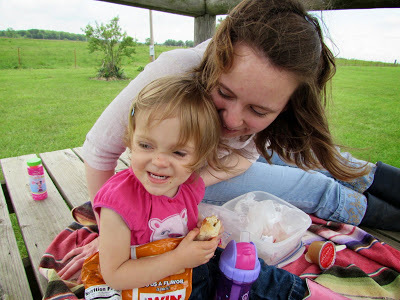 Enjoying a picnic out on the playhouse with Grandma and Mimi