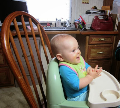 Already, she is crawling around and pulling herself up to a standing position. Watch out, Mom and Dad, here she comes! She loves mealtime, too, and eagerly waits for those fruits and vegetables. Hurry up Mom! Here she is showing us how she claps.
