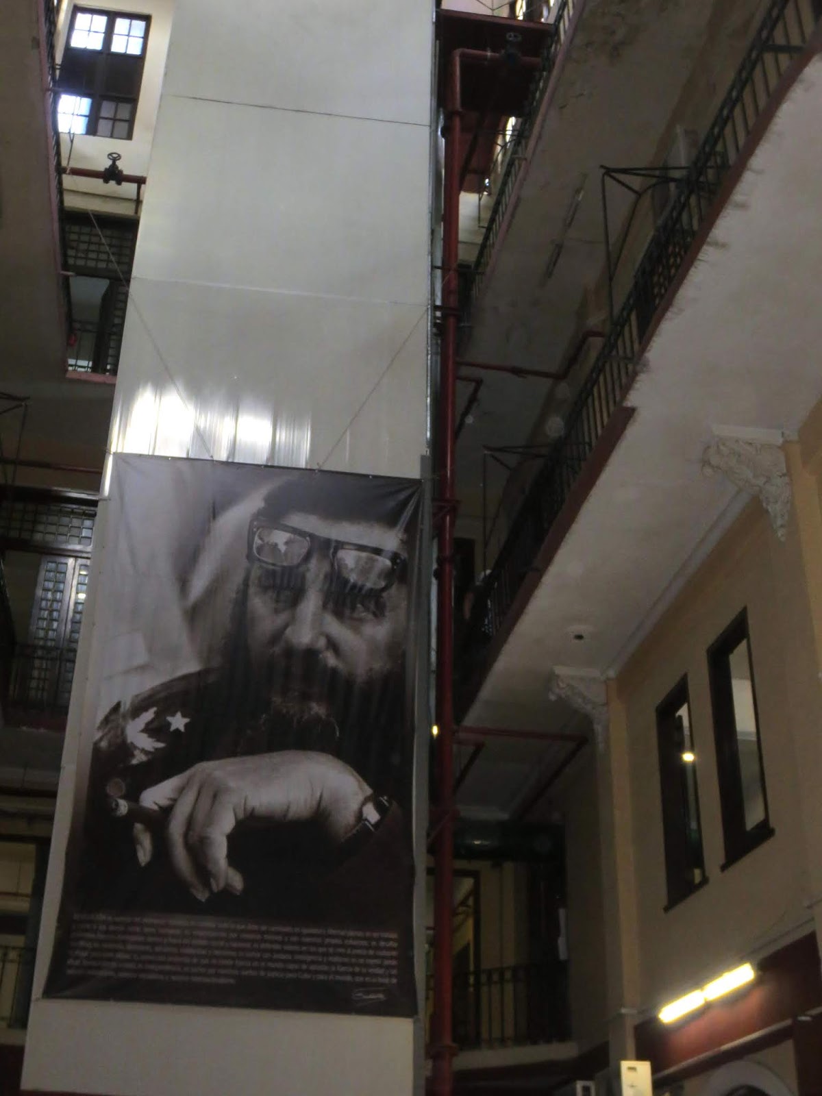 One of our most interesting tours was the H. Upmann cigar factory in Havana. Inside a cement building five stories high, iron railings surrounded an open atrium. There was no air-conditioning. A huge photo of Fidel holding what must have been an Upmann cigar hung down the inside of the building in front of us. "Sorry, no photos above ground level," the factory guide warned us. "No stealing secrets."