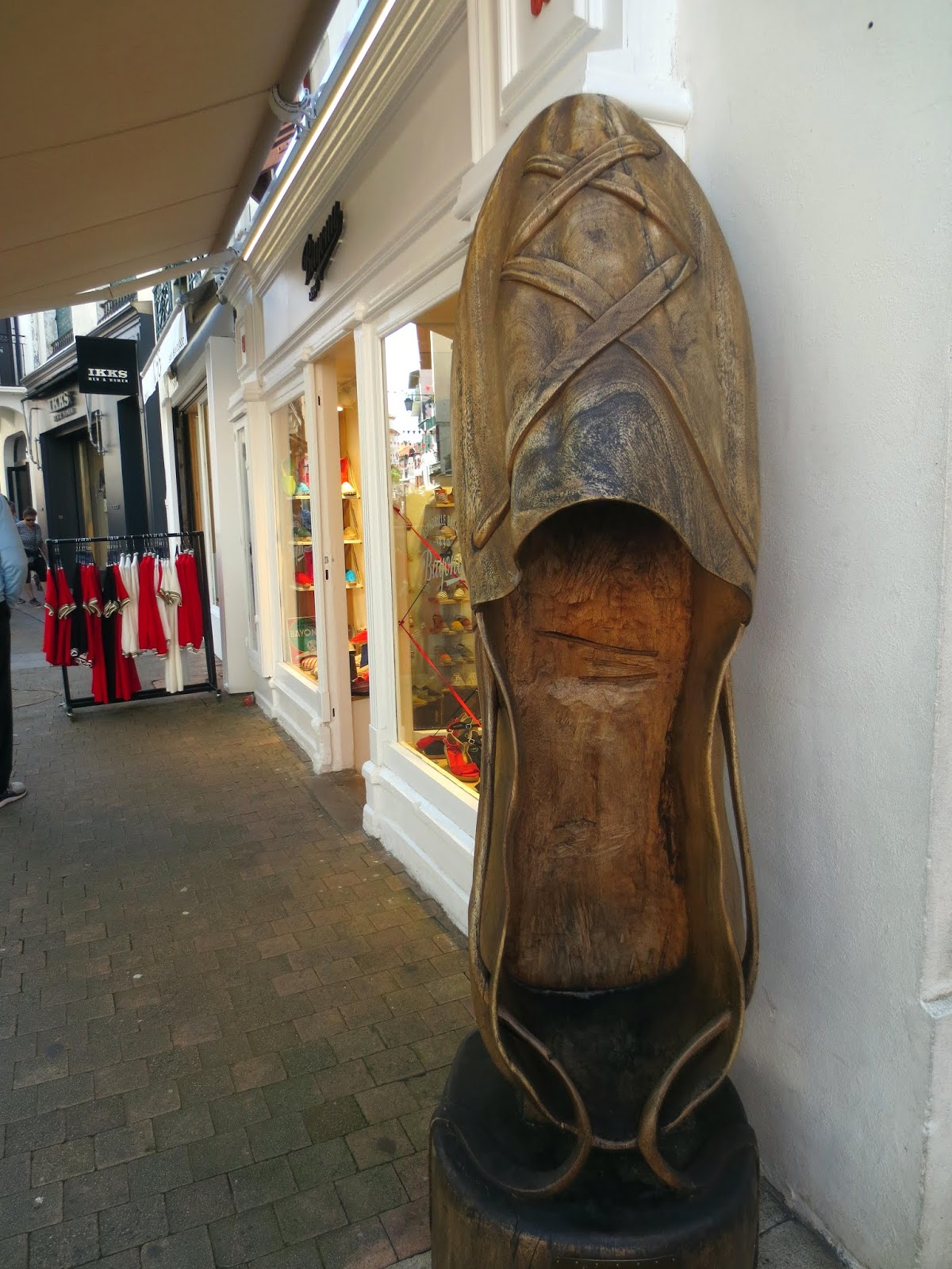 Pilgrims' portal now a UNESCO World Heritage Site, St. John Pied-de-Port, Fr. Our last stop on the French side was St. Jean de Luz, a larger bustling town with pedestrian main street, whose shopkeepers announced their professions outside in sculpture, similar to towns in Austria. The Cathedral there had typical Basque rows of balconies along two walls, Romeo and Juliet style, with gilt ornamentation, making the inside much less austere than the outside.