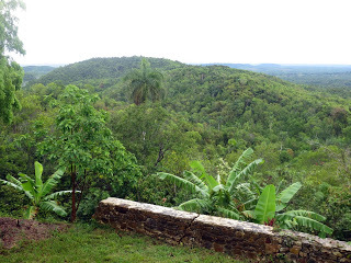 View toward Fla. Strait from former coffee plantation in the Sierra del Rosario Mts., northwest Cuba. Each seedling was planted. After four days eating the national cuisine of pulled or roasted pork, fricasseed or grilled chihcken, black beans and rice, some of us experimented with local specialties like ceviche or octopus. Mojitos, Cuba Libres (the national cola mixed with rum), and Pina Coladas were served liberally with ice cubes from the local water supply. As a result, several of our group began to have gastrointestinal ailments. There was a doctor on duty 24/7 in our hotel, who provided an antibiotic shot in the derriere. "Octopus is notorious for causing your problem," he told the patients. There was no charge.Excluding hotels, public restrooms throughout our tour had attendants standing outside with a roll of toilet paper. With the equivalent of a $.25 tip, one received several sheets before entering. There were none inside. A bucket stood next to each toilet to prevent paper from being flushed into the sewer system.
