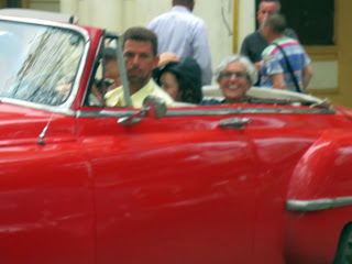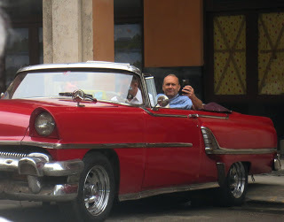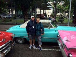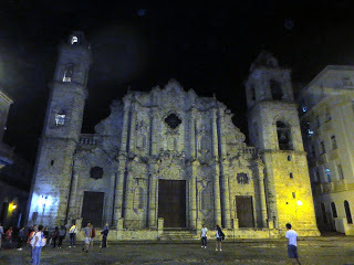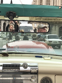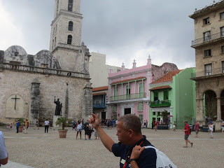 St. Francis Cathedral, Havana, across from the cruise ship terminal Our vintage car did not disappoint! Charley and I rode in a 1950 Buick with its original engine. Only one windshield wiper worked and the speedometer had died a long time ago. When it started to rain, the owner put the canvas top up. Each of us got wet through a two-inch gap, but we didn't even feel it!