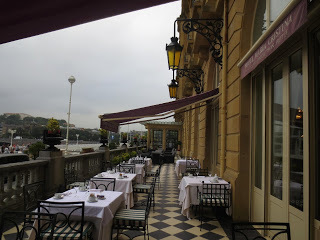 Hotel Maria Cristina, San Sesbastian, Spain San Sebastian is known for three things: its spectacular beaches, its Parto Vieja ("Old Part" of the city), and its food. The international jazz festival in July and international film festival in September call San Sebastian home. We walked around Monte Urgull, the hill that rises abruptly at the edge of the Old City along the peninsula's shore and used toothpicks to spear pinxtos ("haute cuisine in miniature") with olives, green or red peppers, anchovies, pork meatballs, or fried potatoes, displayed on a bar. The bartender tallied them up, along with the Rioja district wines we'd sampled, when we were ready to leave.The following day we shopped inside the old walled city and walked the broad promenade above Playa de la Concha, the beach closest to the city with waves less formidable than the eastern Playa de Zurriola, which attracted international surfers. On the far western end of the Gulf of Vizcaya was Playa de Ondarreta, with few amenities. For dinner (10:00 p.m. in the Parto Vieja) we wound down narrow alleys to sit against a newer version of the old city walls in a restaurant where fishermen unloaded their catch in the front and the cooks hustled the catch inside. We ordered some greens and a lobster salad to share. When the "salad" arrived, a mountain of seafood sat on a platter before us: two cooked, split lobsters; steamed mussels and clams; potatoes; tomatoes; whole onions; kernels of corn. At home in Massachusetts we called this meal a "clam boil" or a "lobster bake," depending on whether it's boiled in a steamer pot or cooked over seaweed in a pit. Somehow we managed to devour our "salad."