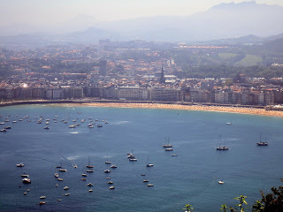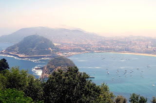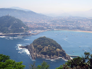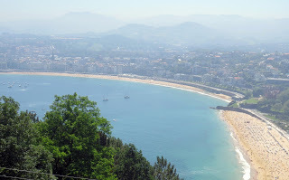 Views of city of San Sebastian from amusement park atop Mt. Ulia with Pyrenees in background. Surfers' beach is around promontory to left.Basque poet Kirmen Uribe summed up the appeal of his native coastline between San Sebastian and Bilbao: "I'm going to stay here - between the green waves and the blue mountains." We drove west along the coast through Zarautz, a former whale-hunting town with extensive photo museum and huge surfing waves rivaled only in Mundaka, which boasted long rollers and left-curling pipeline. "Hip" sculptures lined the beach promenade in Zarautz. We followed the twisting sea road west through Zumaia, a fortified medieval town with fossils embedded in rock cliffs where artist Ignacio Zuloaga thought the light magical. Next were Ondarrao and Lekeito, the Basque Country's leading fishing ports with major tuna fleets. Finally we headed inland toward Gernika and Bilbao.