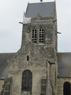 Recreation of parachutist John Steele hanging from church steeple in Ste. Mere-Eglise, Fr., on D-Day