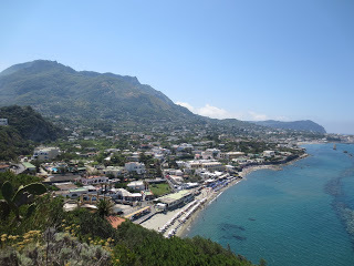 A view from our hotel on Ischia toward Naples and Mt. Vesuvius Ischia faces Capri but lacks Capri's glitz. It is characterized by fishing villages that have exploded into resort towns. There are no cruise ships or designer boutiques. Towns spill over the lush thermal hillsides into each other and motorbikes veer in every direction on the winding roads lined with fuchsia bougainvillea. Mt. Vesuvius across the Gulf of Naples and Mt. Epomeo above our heads remind residents and visitors that the area is ripe for volcanic activity, as evidenced by an earthquake last year in Casamicciola, one of the towns on our walking route.