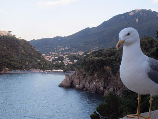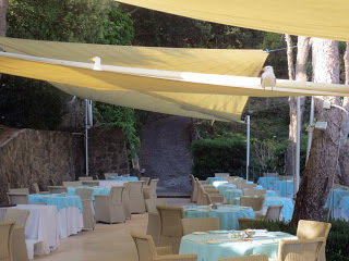 Town of Forio, Ischia Our hotel was a former lookout tower sitting on a promontory facing the mainland. In its "-1" rooms in the "basement" are the thermal waters of the spa and all other spa amenities. Rooms are spread throughout the tower, as well as across the hillside. The climb is not easy over the cobblestones and up the stone steps to our room in the forest, but going down takes no time when we're hungry! Dining is al fresco in a separate pavilion overhanging the pool and sea.
