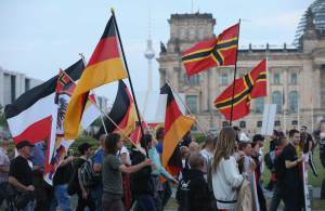 Furthermore, Islam and immigration were not even their main concerns. “The primary motivation for participation in PEGIDA demonstrations,” Vorländer wrote, “is a general dissatisfaction with the country’s political direction.” The second-most-often-named incentive among the study’s 1,200 respondents was dissatisfaction with the media and with society. In other words, a not insignificant segment of the electorate was suddenly content to vent its rage alongside people carrying signs reading “Rapefugees Not Welcome!” and waving the “Wirmer flag,” a proposed post-World War II flag for Germany that has been co-opted by the extremist right.