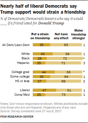 A new Pew poll shows that Democrats—especially educated white liberal Democrats—would have significantly more difficulty maintaining a friendship with a person they disagreed with politically than either Republicans or less privileged Democratic constituencies.
